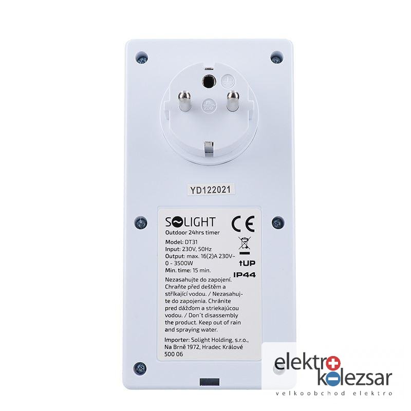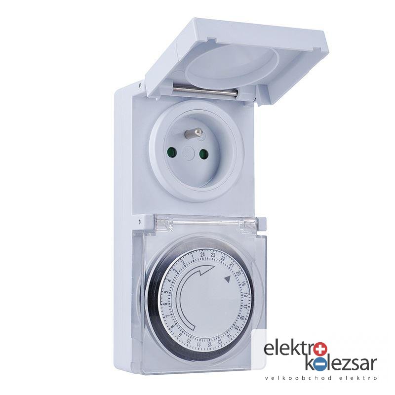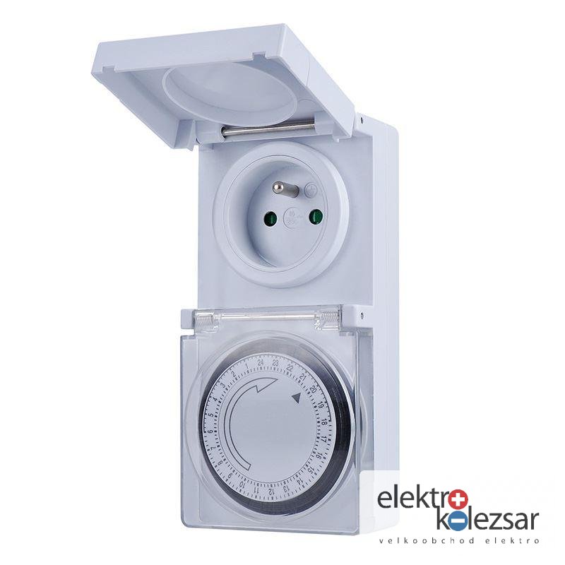 Tento mechanický časovač nabízí 24hodinové nastavení s minimálním časovým úsekem 15 minut. Disponuje dětskou pojistkou a pracuje na napětí 230V/16A, 50Hz. Má kryt zásuvky s gumovým těsněním a poskytuje voděodolnou ochranu na úrovni IP44.