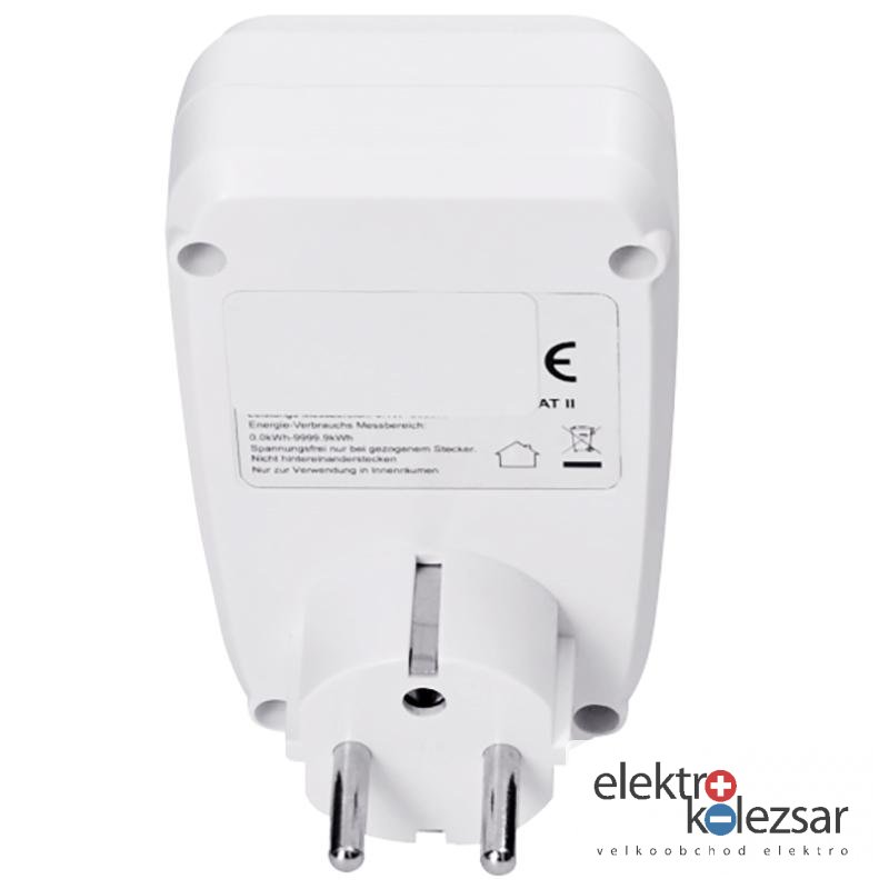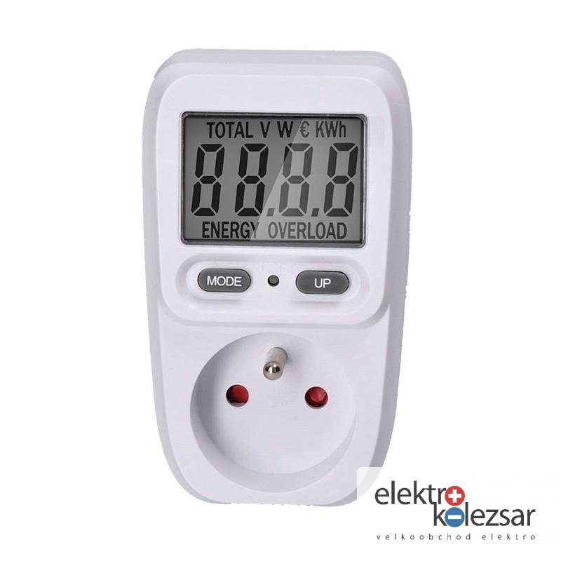 Měřič spotřeby elektrické energie s přehledným LCD displejem o úhlopříčce 2" (5 cm) umožňuje měření spotřeby až do 9999 kWh s příkonem v rozmezí 2W až 3680W/16A. Disponuje nastavením ceny za energii, dvěma tlačítky pro snadnou obsluhu, funkcí přesného výpočtu ceny a měření spotřeby. Obsahuje dětskou pojistku, indikaci překročení maximálního příkonu ("overload") a měří elektrické veličiny, jako je napětí a okamžitý odebíraný výkon. Integrovaný stabilizátor napětí zajišťuje přesnost měření s odchylkou do ±1,5 %. Pracovní teplota se pohybuje mezi 0 až +50 °C. Napájení je AC 230V, 50Hz.